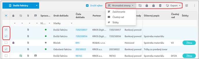 Ako prvé si doklady, na ktorých chceme funkcie spustiť, označíme. Sprístupní sa menu pre hromadné funkcie.