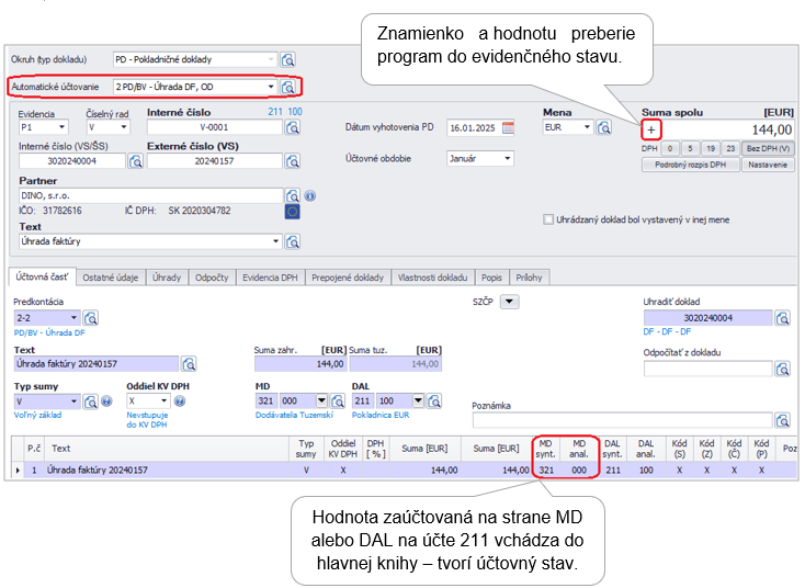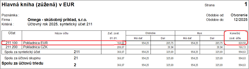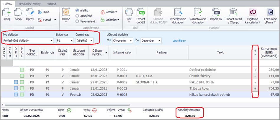 Na základe začiatočného zostatku a všetkých príjmov a výdavkov vypočíta program evidenčný zostatok, ktorý sa musí rovnať tomu, čo máme fyzicky v pokladnici a tomu, čo máme v Hlavnej knihe na príslušnom účte 211.xxx.