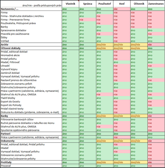 - Účtovník - môže vytvárať, opravovať a mazať všetky záznamy, avšak nemôže upravovať firemné nastavenia. Taktiež môže sťahovať doklady do účtovníctva v programe Jednoduché účtovníctvo ALFA plus a Podvojné účtovníctvo OMEGA.