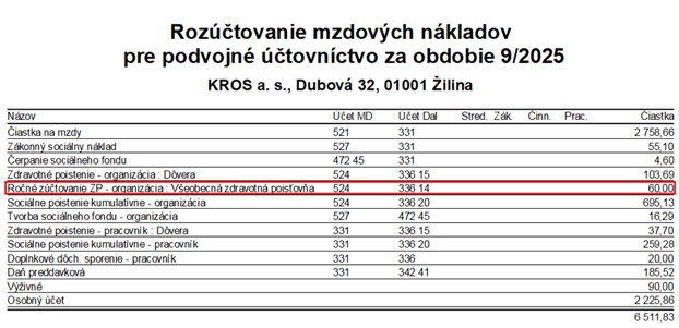 Evidovaním cez výplatu sa zároveň suma preplatku/nedoplatku z RZZP za organizáciu zobrazí aj na dokumente Rozúčtovanie mzdových nákladov pre podvojné účtovníctvo (Tlač – Tlač – Rozúčtovanie – Rozúčtovanie mzdových nákladov pre podv. účtovníctvo) a v exporte pre účtovníctvo .