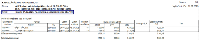V našom príklade mesačný platiteľ DPH vytlačil prehľad neuhradených záväzkov ku dňu 31.07.2025, kde boli 2 záväzky, ktorým uplynulo od lehoty splatnosti 101 dní: