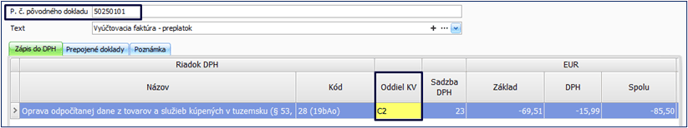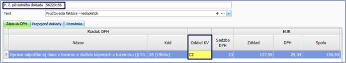 - V evidencii DPH je predvolený oddiel KV C.2. Vo formulári doplňte Poradové číslo pôvodného dokladu, ku ktorému je ťarchopis vystavený.